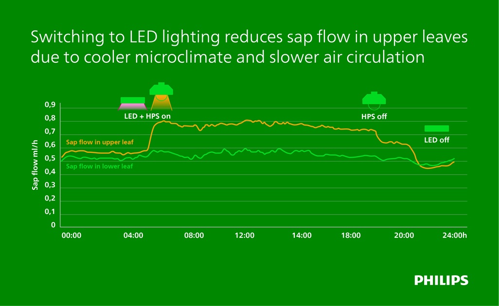 The greenhouse uses a hybrid lighting setup, combining HPS (140 µmol/m²/s) and Philips LED toplighting  (240 µmol/m²/s) combined with Philips LED interlighting in the middle of the canopy (80 µmol/m²/s). Sap flow sensors provided real-time data on how the lights’ on-off rhythm affected leaf transpiration. The graph below shows that when the HPS lights were turned off, sap flow in the upper leaves dropped significantly, but the sap flow rate in the lower leaves remained unaffected.