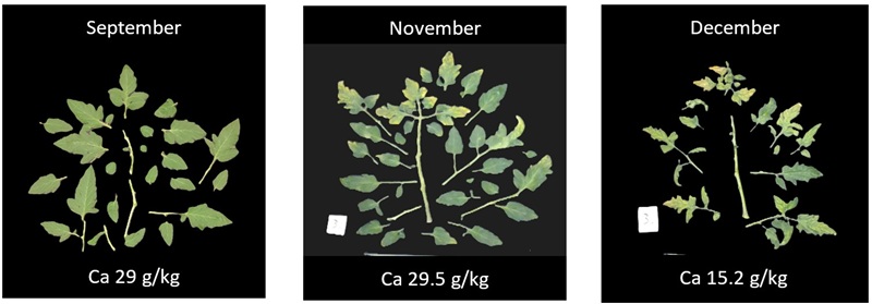 Tomato leaves in September, November and December. Each leaf is the 8th leaf counted from the top of the plant. Despite steady water uptake, the calcium fails to reach the plant head.
